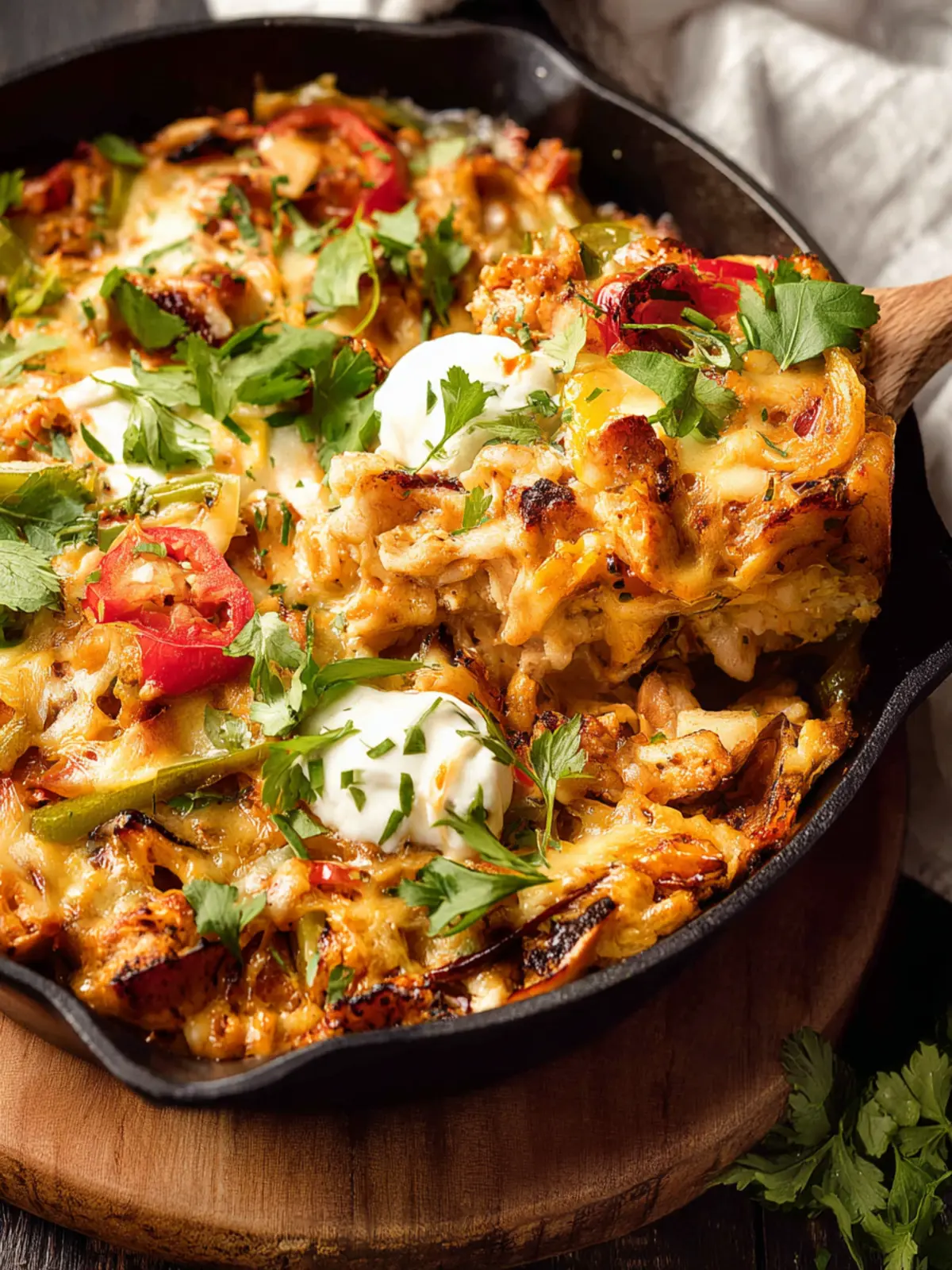 A delicious and easy chicken tortilla bake made with shredded chicken, bell peppers, beans, and cheese.