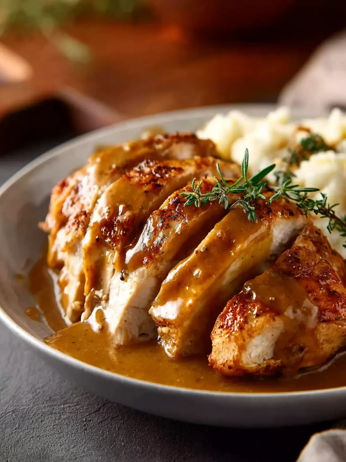 A delicious dish featuring seared chicken breasts topped with a velvety gravy.