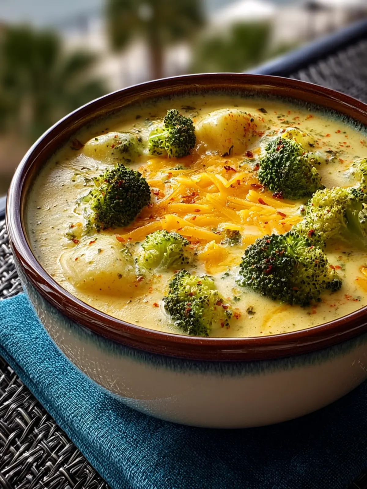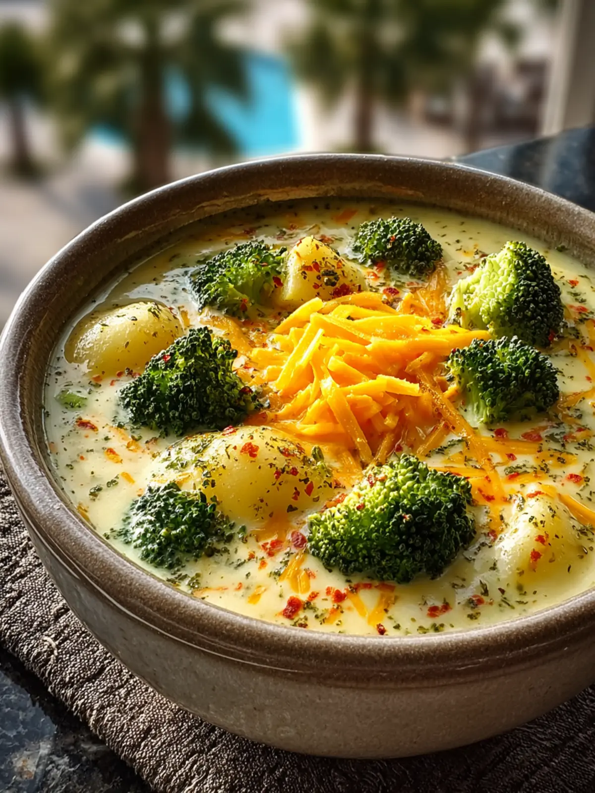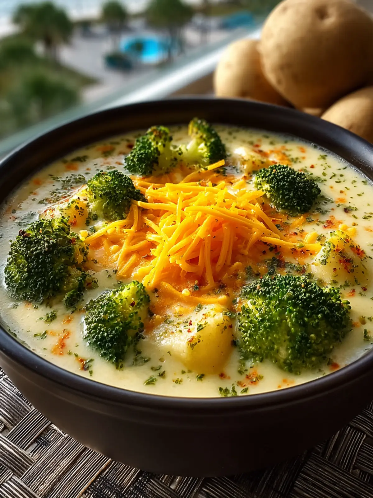 A comforting and creamy soup featuring potatoes, broccoli, and cheese.