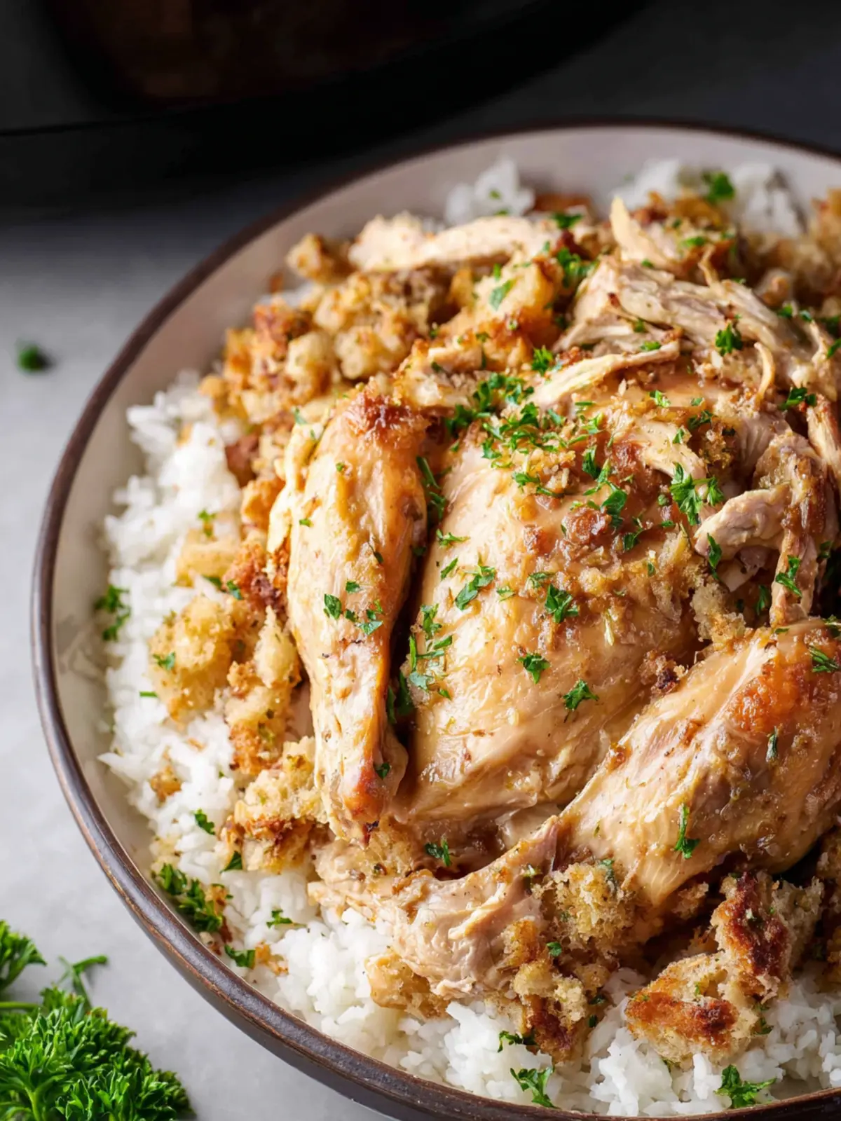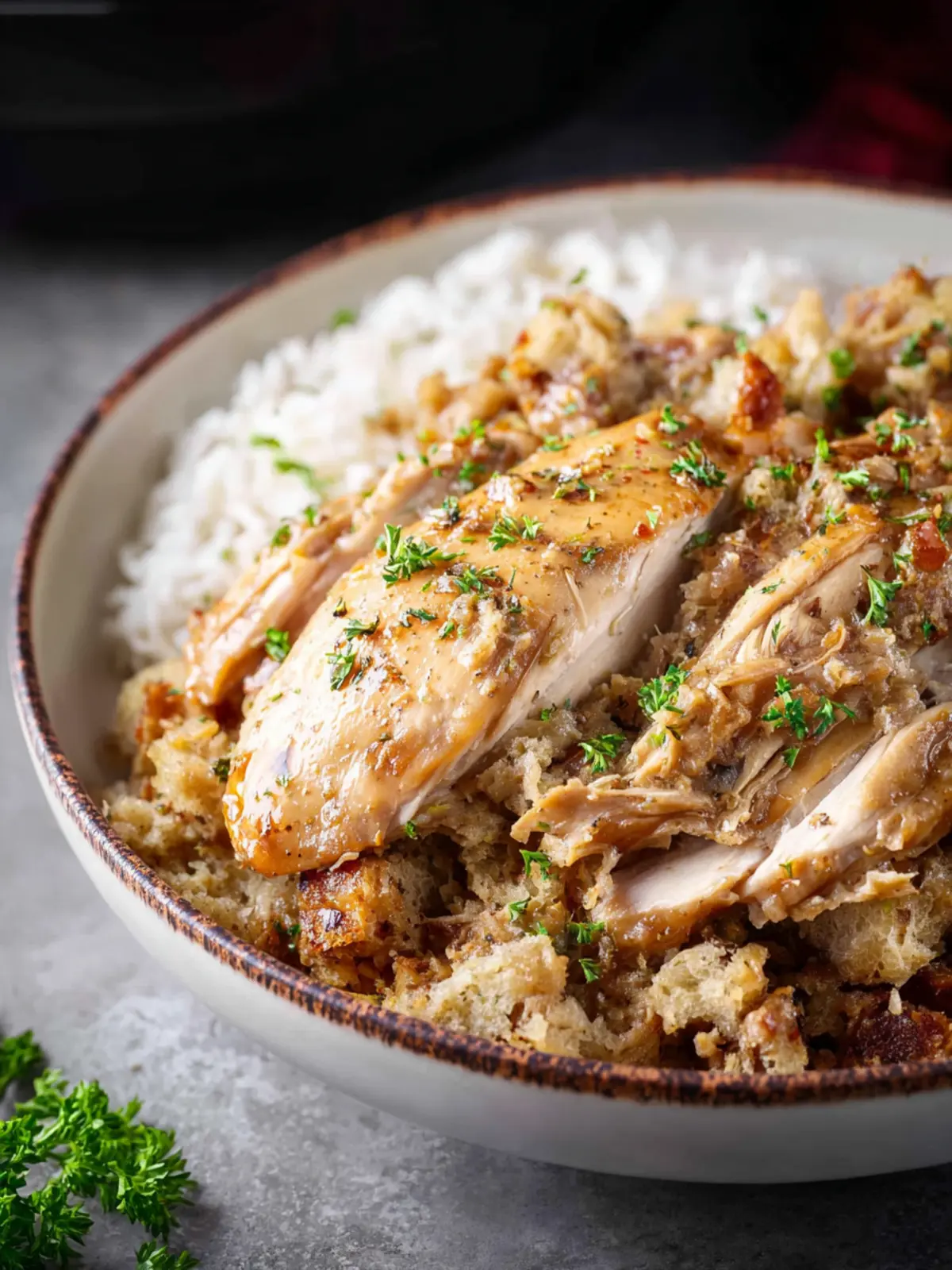 This slow cooker chicken and stuffing dish is an easy, comforting meal that combines tender chicken with savory stuffing and a creamy sauce.